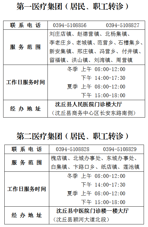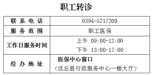 生活中,很多乡亲们在外就医,对转诊转院政策及咨询电话不了解,现将沈丘县转诊转院政策、转诊电话和各乡镇城乡居民参保咨询电话公示如下。参保患者在县内就医,确因病情需要转到上级医院就诊的,由沈丘县人民医院或沈丘县中医院的主治医师开具转诊单,而后办理正常转诊,享受正常的医保待遇。未按规定办理转诊、异地就医相关手续或自行到参保地外医疗机构住院的,其医疗费用按规定比例降低20%。参保居民因急诊、精神病或恶性肿瘤等原因未及时办理转诊手续的,应当在入院后7个工作日内向医疗集团牵头医院(沈丘县人民医院、沈丘县中医院)转诊办公室申请备案,补办转诊手续,审批同意后办理正常转诊。周口市域内,无需转诊,直接就医报销。异地就医参保人员在外长期居住、工作、上学的,可通过线上河南医保小程序、国家医保服务平台APP或线下各乡镇经办服务中心进行登记备案,备案成功后,可在异地持社保卡或者电子医保码就医出院直接报销(住院前一天办理有效)。