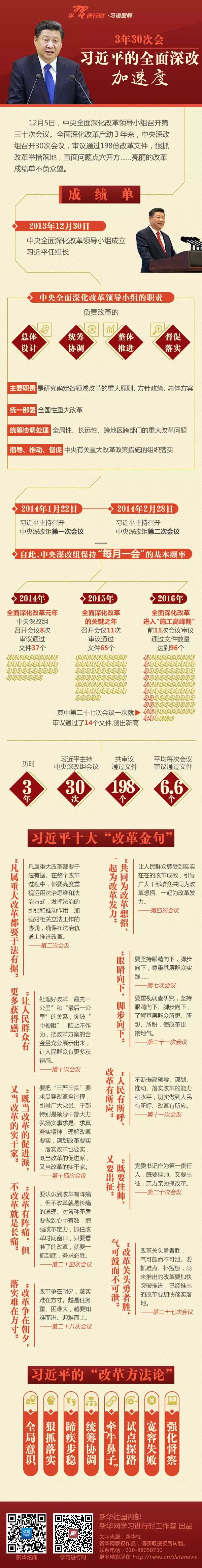 2016年12月5日,中央全面深化改革领导小组召开第三十次会议。全面深化改革启动3年来,在习近平总书记直接领导下,中央深改组的30次会议,牢牢把握改革正确方向,及时提出阶段性任务目标,着眼全局性重大问题进行顶层设计,审议通过198份改革文件,狠抓改革举措落地,直面问题点穴开方……