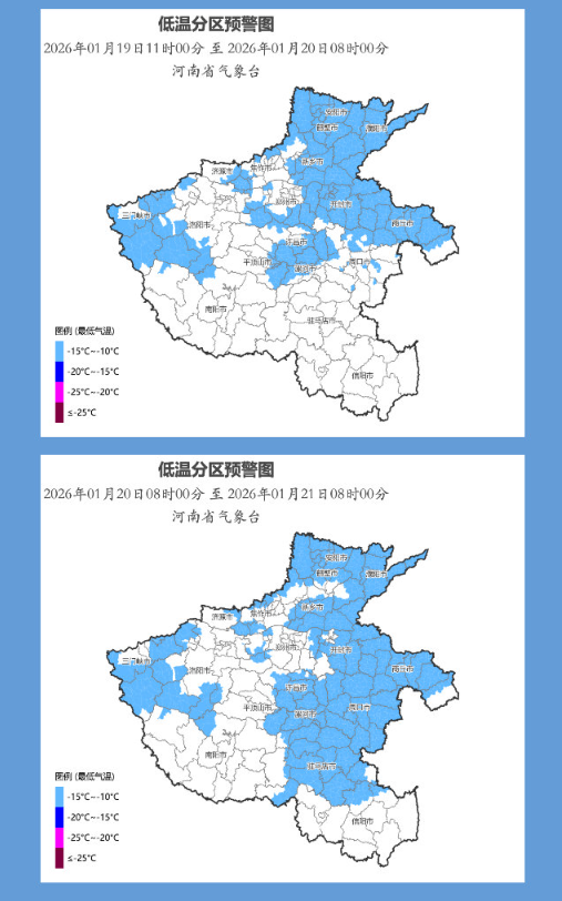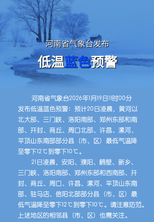 河南省气象台2026年1月19日11时00分发布低温蓝色预警:预计20日凌晨,黄河以北大部、三门峡、洛阳南部、郑州东部和南部、开封、商丘、周口北部、许昌、漯河、平顶山东南部部分县(市、区)最低气温降至零下12℃到零下10℃。
