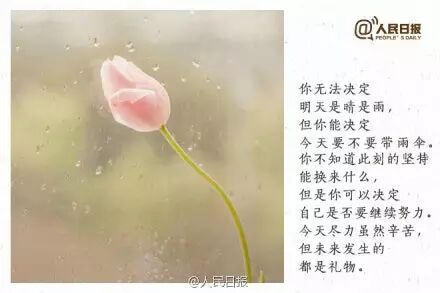 你无法决定明天是晴是雨,爱你的人是否能留在身边,此刻的坚持能换来什么,但你能决定今天有没有准备好雨伞,有没有好好爱人,以及是否足够努力。不要忘记自己坚持了多久才走到这里,今天尽力虽然辛苦,但未来发生的都是礼物。